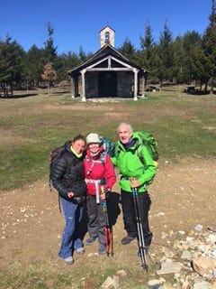 It is a lovely spot.  We put our packs on picnic table and gathered our stones. As we approached the cross Ernest used ITunes and played Kristen DeMarco’s song. It is Well Witn My Soul!  We laid our rocks among the millions and I burst into tears and sobbed. What an opportunity! After our usual lunch of peanuts, an orange and a protein bar we donned our packs and yelled “Buen Camino” to three approaching pilgrims. As soon as we spoke the girl yelled out, ” Jan and Ernest from California….no, Georgia. ” it was Sara whom we had met the first night in Fromista! We hugged and laughed and hugged again. Her two walking companions were from Japan and Peru. God calls every nationality.
