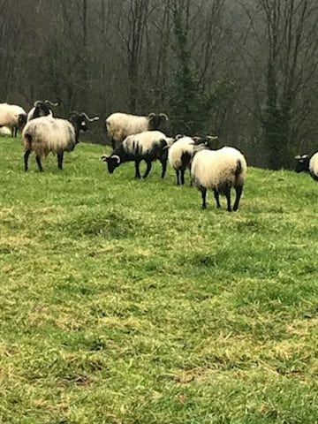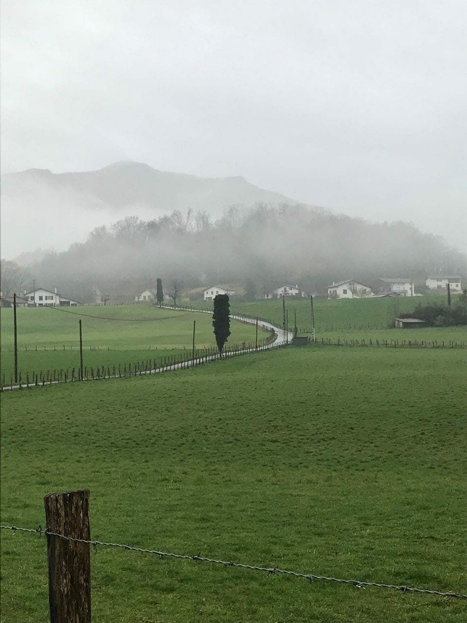 The Basque region is much wealthier than the region of Galicia. The hospitality and congeniality is consistently gracious and kind in both regions. The terrain is absolutely stunning with steep emerald green pastures dotted with herds of wooly sheep. Littered fog remained over the Pyrenees. Basques homes are painted white with deep red or green trim. The color of their flag. They are neat; well painted; substantial buildings. Chimney smoke pouring forth that assures us that a warm family resides inside.