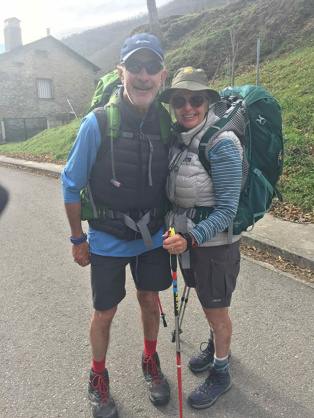 Second side: Ernest and me. We have always been best friends even when we would consider murder but this has been such a fun experience for us. Ernest has such a great sense of humor. Last night he said, ” Jan, I came out of the bathroom and saw my reflection. I thought that the wild man from Bornio was looking at me!” I laughed so hard I cried. He is the Lewis and Clark of this expedition and the kindness of his heart shows so brightly. He saves bread for the stray dog. Buys the meal for the hungry pilgrim. Returns dishes to the kitchen. Buys his wife cafe con leche first. Insists that I stay beside him in potential danger. The Camino does not make your character but it certainly brings it out!